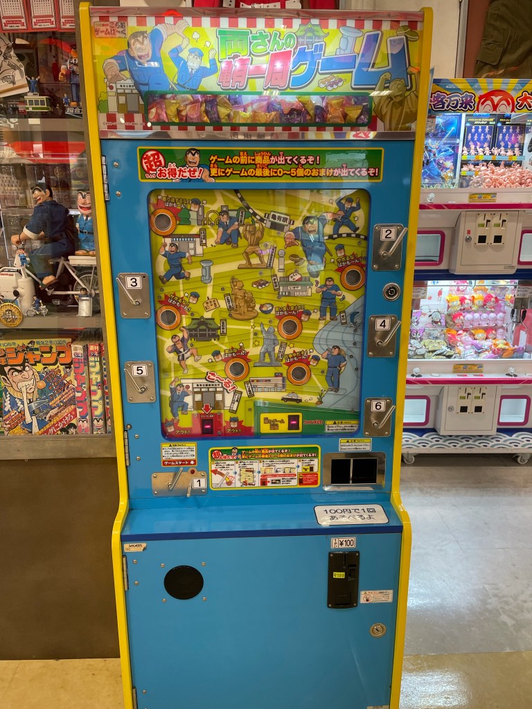 3Fに見つけました「こち亀ゲームパーク」。いいですね~ 久しぶりにゲームセンターで童心に戻ります。「両さんの亀有一周ゲーム」これは我々が小学校の頃、近所の駄菓子屋で熱中した新幹線ゲームの亀有版ではないですか! 私の友達がゲーム正面ガラスを外し、不正に景品をゲットした、我々の注意を無視し更に不正を続けた挙句、店のおやじさんに見つかってしまった新幹線ゲーム亀有版ではないですか! テンション上がりますね!(^^)!