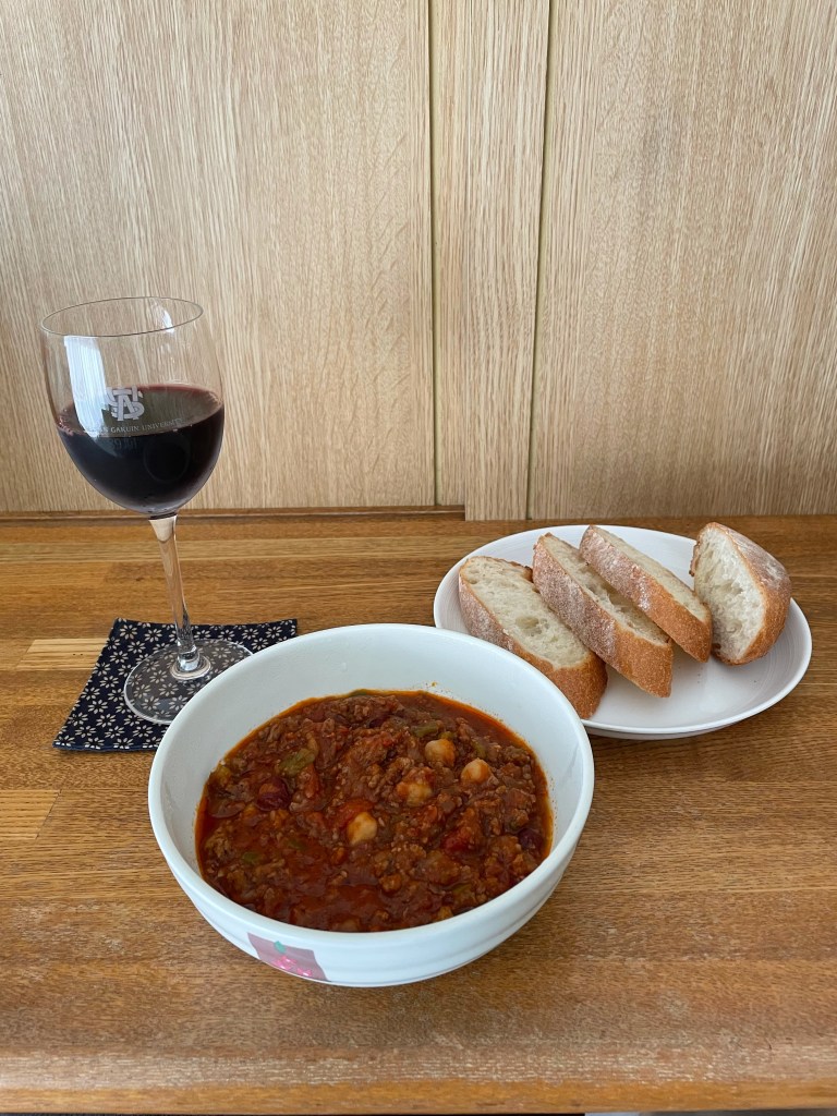 家で作ったチリコンカンとフランスパンに赤ワインが最高に合います。チリコンカンは元々メキシコ発祥の料理ですが、栄養もあり最高に美味しいです。