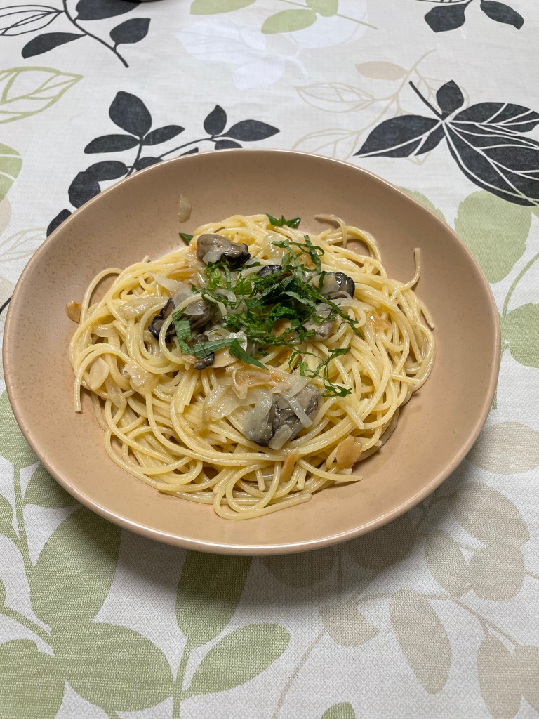 今日の昼食は牡蠣のパスタです。 ふるさと納税で生牡蠣と一緒に届いた瓶詰め牡蠣のアヒージョとパスタと混ぜただけですが、結構いけました😊