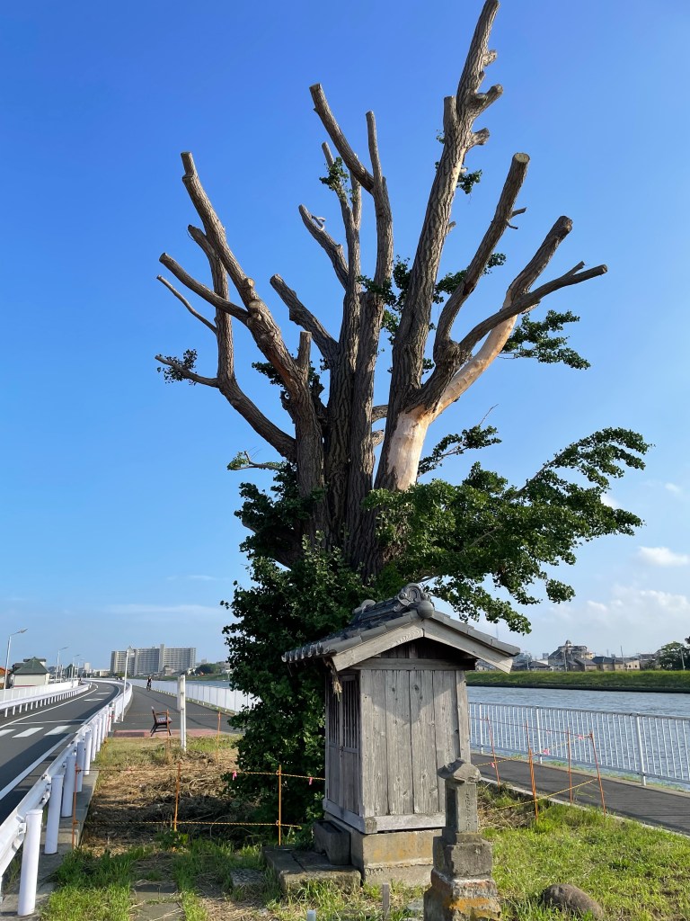 しばらく走ると大木があり、そばに祠が建てられてました。御神木なんだろうね!