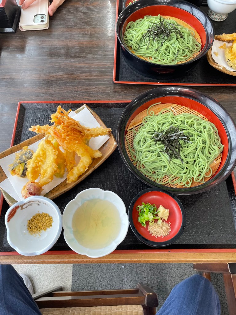 宇佐神宮でランチ、参道入口のお食事処で天ざるかぼす麺を食べました。かぼす麺?聞き慣れませんね、私も初めて食べましたが、かぼすを練り込んだ麺を蕎麦の様に食べます。 爽やかでかぼすの風味がありこんな暑い日にはもってこいです😄