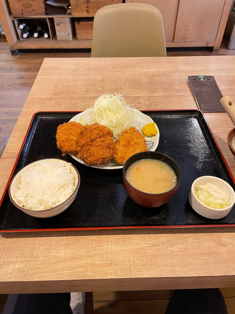 メニュ表を見て、あれも食べたいこれも食べたい! 結局、欲張って揚げ物三種盛(ロース メンチ ポテト)に決定