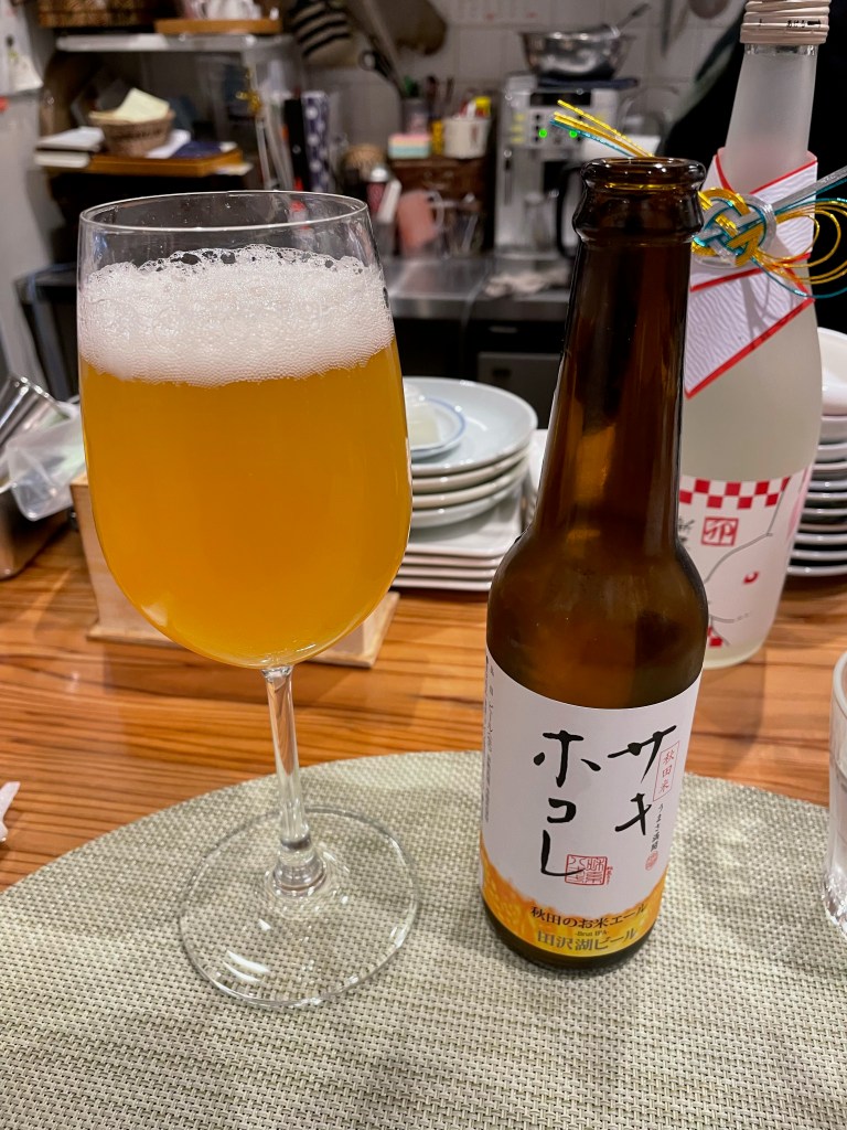 店内はテーブル3席とカウンターの小さなお店。13時過ぎてましたが、テーブル席は満席なのでカウンターに座り、まずはビールを戴きます。秋田の田沢湖ビールがありましたので注文しました。地ビールはフルーティーでコクがあり大好きです。