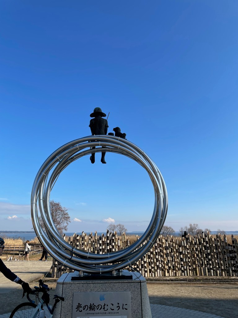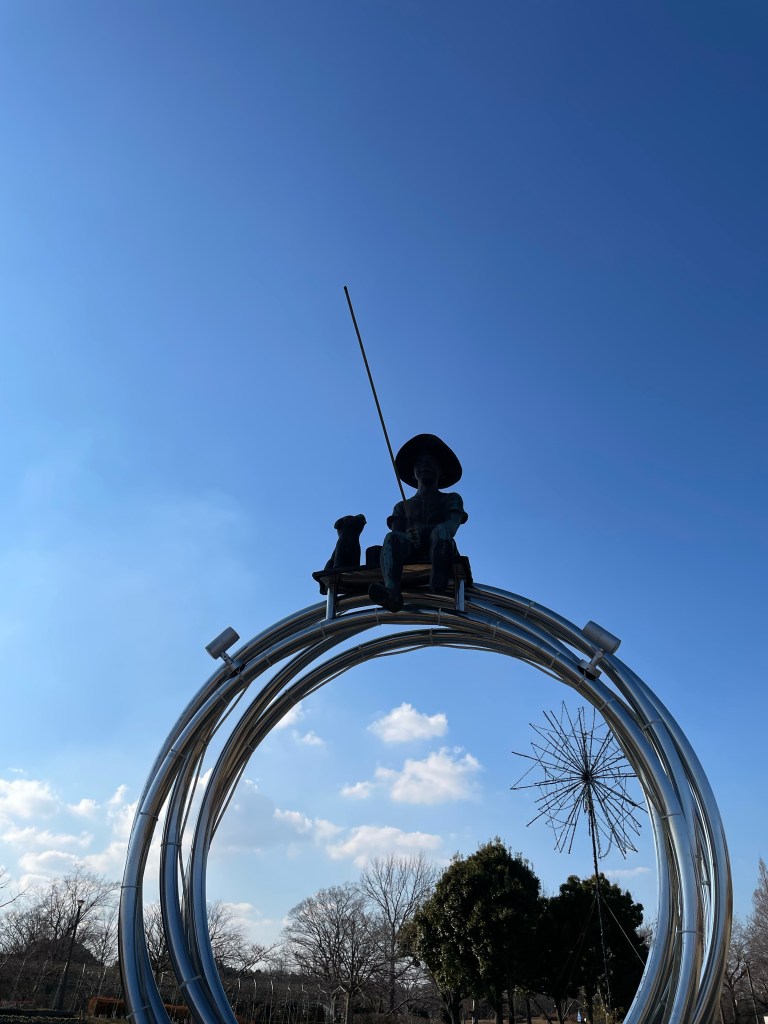 公園に素晴らしいモニュメントを見つけました。少年と犬が釣りをしてます(題 光の輪のむこうに)この世界観は好きです