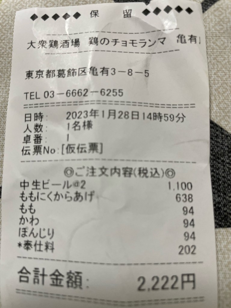 今日は、いつかやってみたかった亀有昼飲み、駅南口徒歩2分にある鶏のチョモランマさんに来ました。店名が妙で店頭から中の様子が見えないので入りづらいですが、思い切って入りましょう。店内は、ちょい飲みには良い感じ、若者ばかりですが、皆んな昼飲みしてます。
