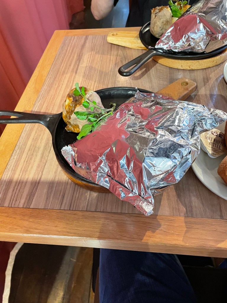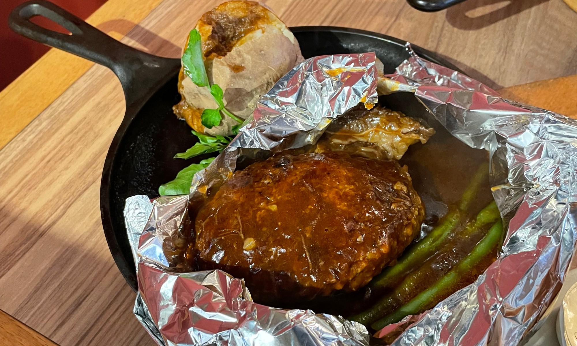 ハンブルクステーキは、アルミホイルで包まれてやって来ました。ホイルを破るとハンバーグとシチュー風に煮込まれた肉がのぞきました。