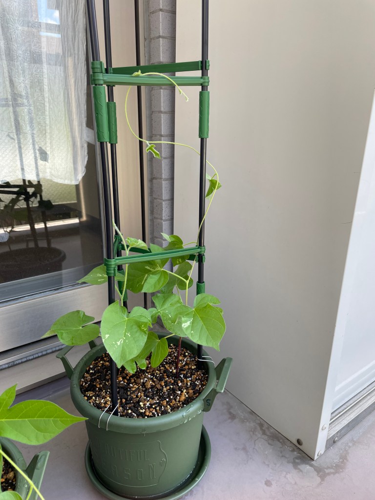 アサガオは4週間目に入り支柱を立てました。つるが伸びて反時計回りに市中に巻いていきます、アサガオっぽくなりました!(^^)!