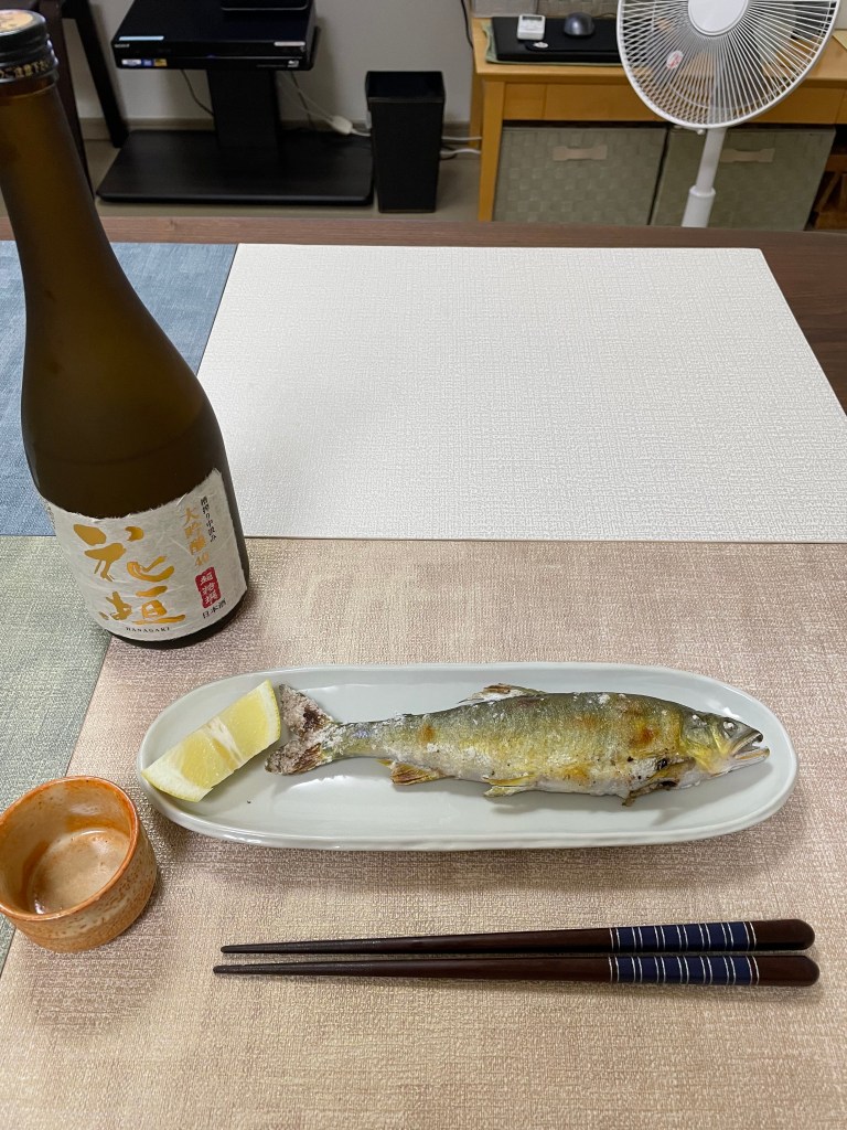 先日、スーパーで鮎を買って、家で塩焼きにして食べました