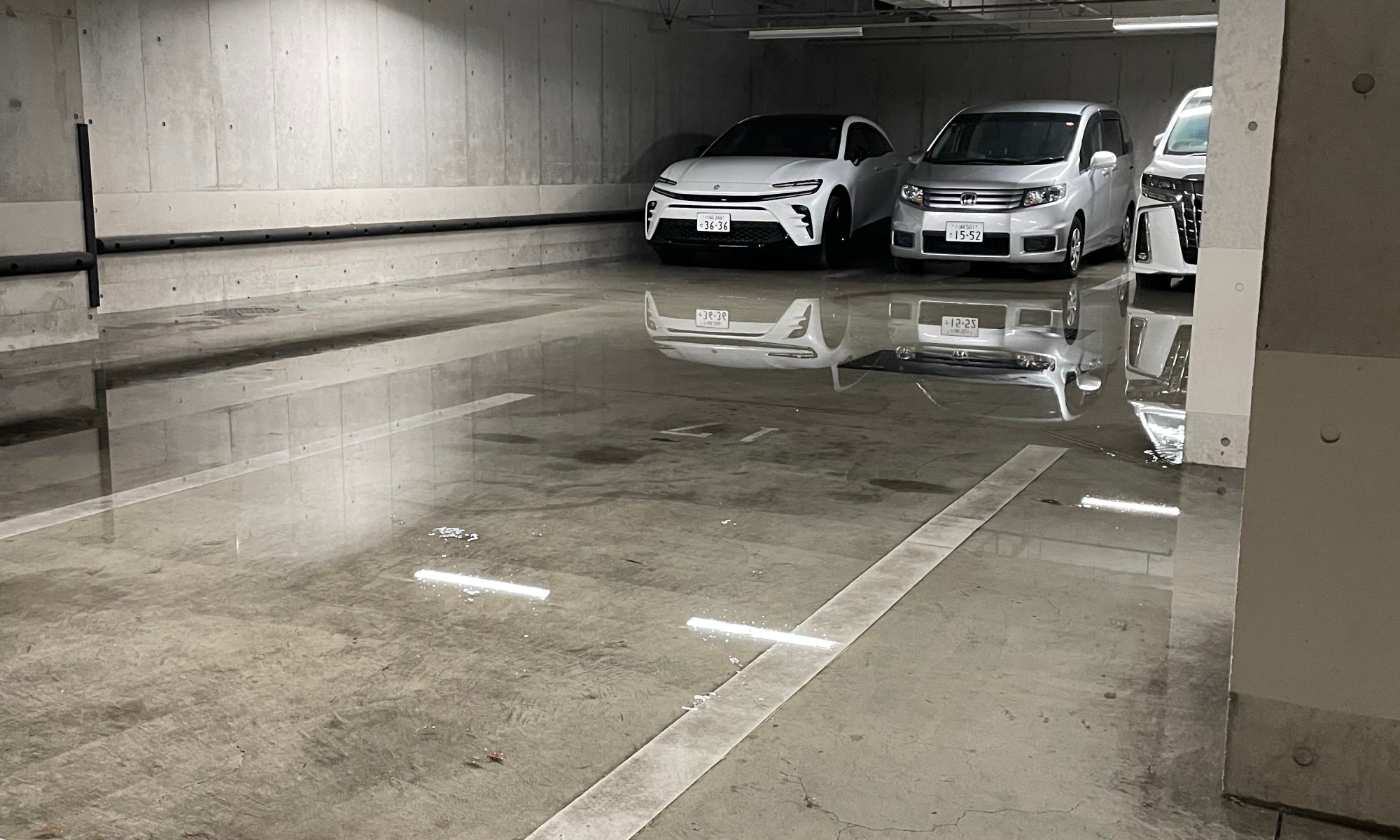 少し心配になり地下駐車場に降りてみると、エレベーターが地下に降りたとたん、エレベーターのガラス扉の隙間から水がザアザアーと落ちてきました。地下駐車場に降りてみると既に5cmぐらい水が溜まっていました。