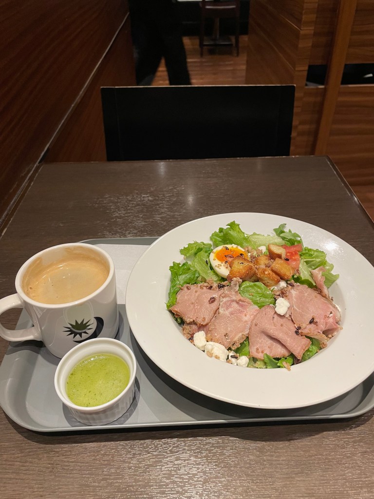 昨日から新年度です、大手町もフレッシュな人多く活気があって良いですね😊 人が多く昼食時は、どの店も混み合います。出遅れると昼食難民化します。 今日は会社のキックオフも終わり、一人でのんびりとランチを味わってます。 Prontのポークサラダとコーヒーセット